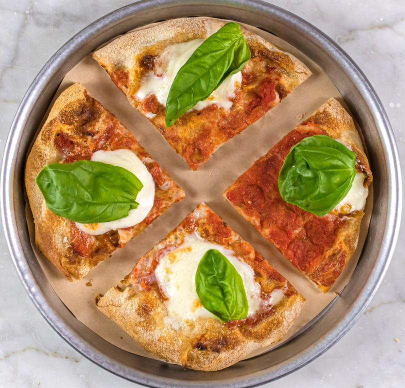 Focaccia rossa con pomodoro San Marzano, petali di Bufala filante e basilico fresco