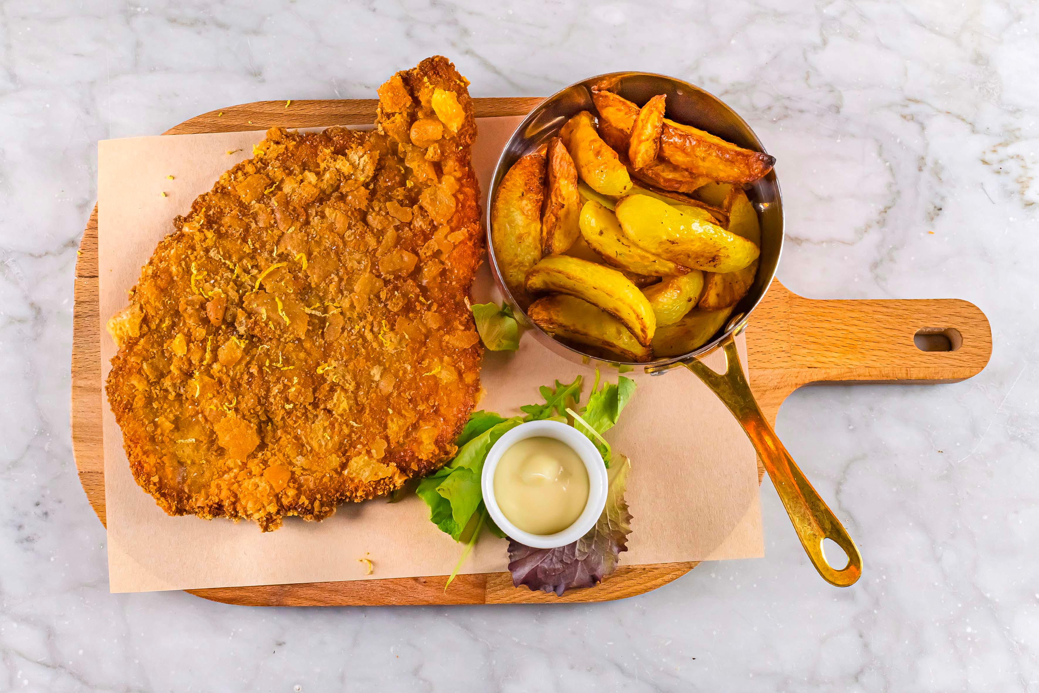 Cotoletta di maiale con panatura di grissini e scorzetta di limone, servita con patate al forno e mayo al Gewürztraminer