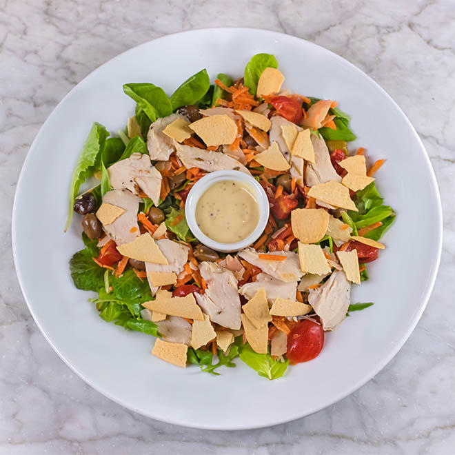 Tenero petto di pollo, misticanza, carote, pomodorini freschi, scaglie di Parmigiano Reggiano DOP 24 mesi, olive taggiasche, cialde croccanti di Parmigiano Reggiano e salsa di senape al miele