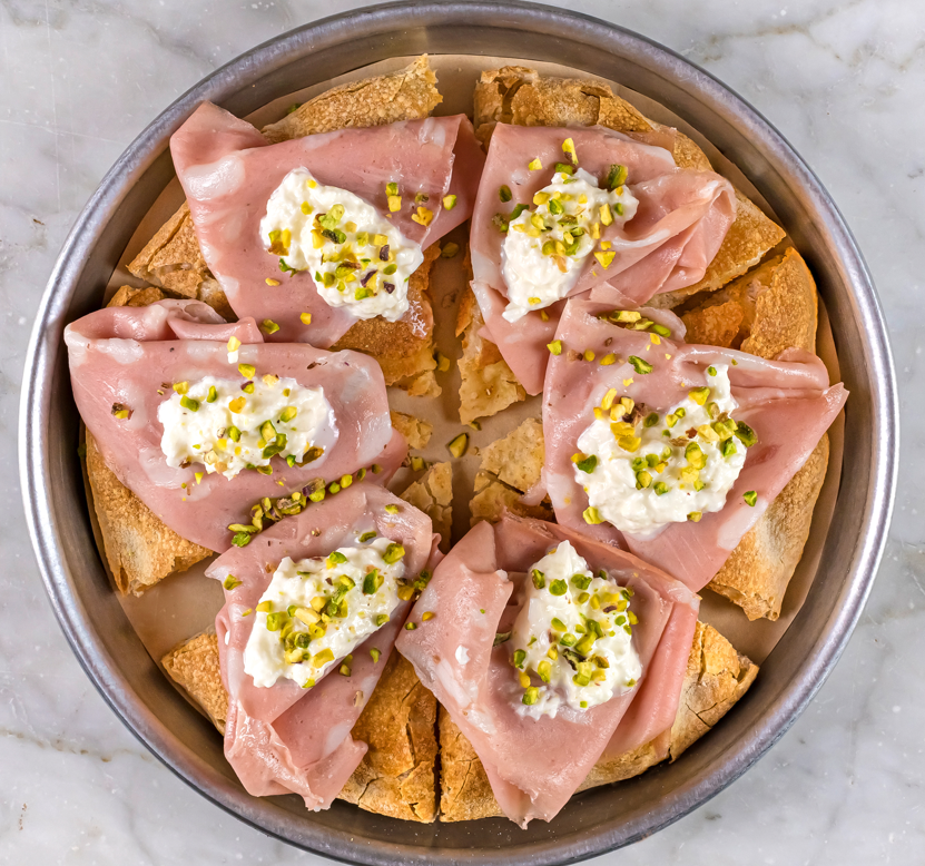 Focaccia bianca con Mortadella Favola Gran Riserva, burrata pugliese e granella di pistacchio