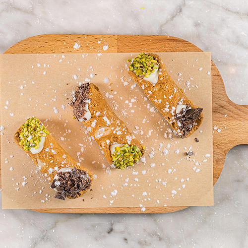 Tre mini cannoli siciliani con ricotta guarniti con granella di pistacchi e scaglie di cioccolato