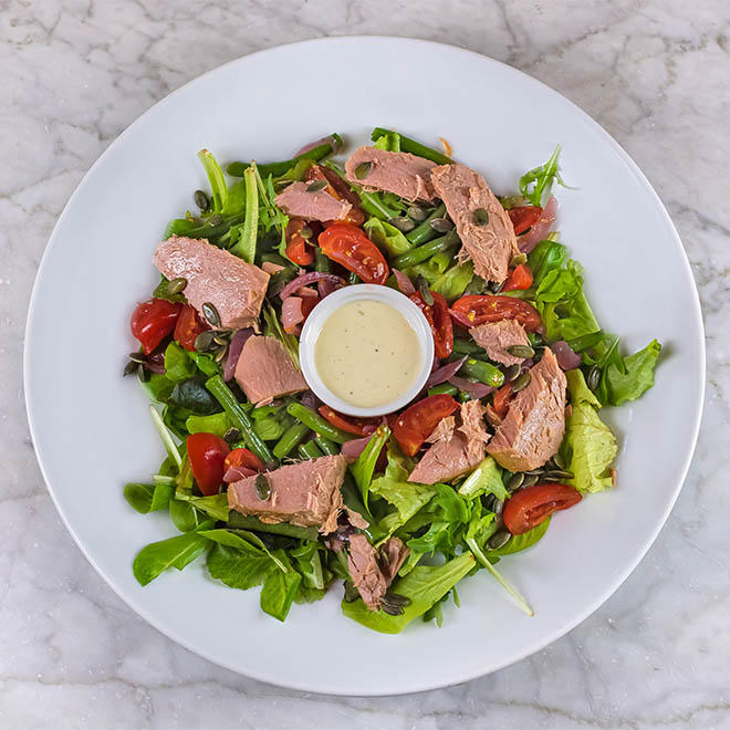 Tonno rosso del Mediterraneo sott’olio “Drago”, misticanza, pomodorini freschi, fagiolini, cipolla rossa agrodolce, semi di zucca croccanti e salsa al Gewürztraminer(Non contiene lattosio - Naturalmente priva di glutine)