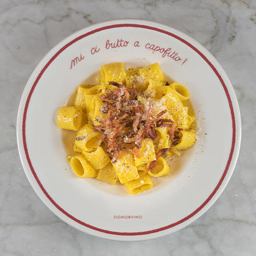 Mezze maniche di grano duro “Il Cappelli” Monograno Felicetti con guanciale croccante marinato al pepe nero, uova e Pecorino romano DOP
