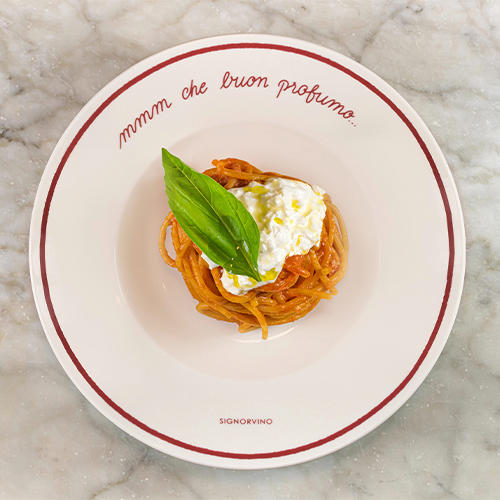 Spaghetti “Il Cappelli” Monograno Felicetti al pomodoro e Parmigiano Reggiano con burrata pugliese e basilico fresco